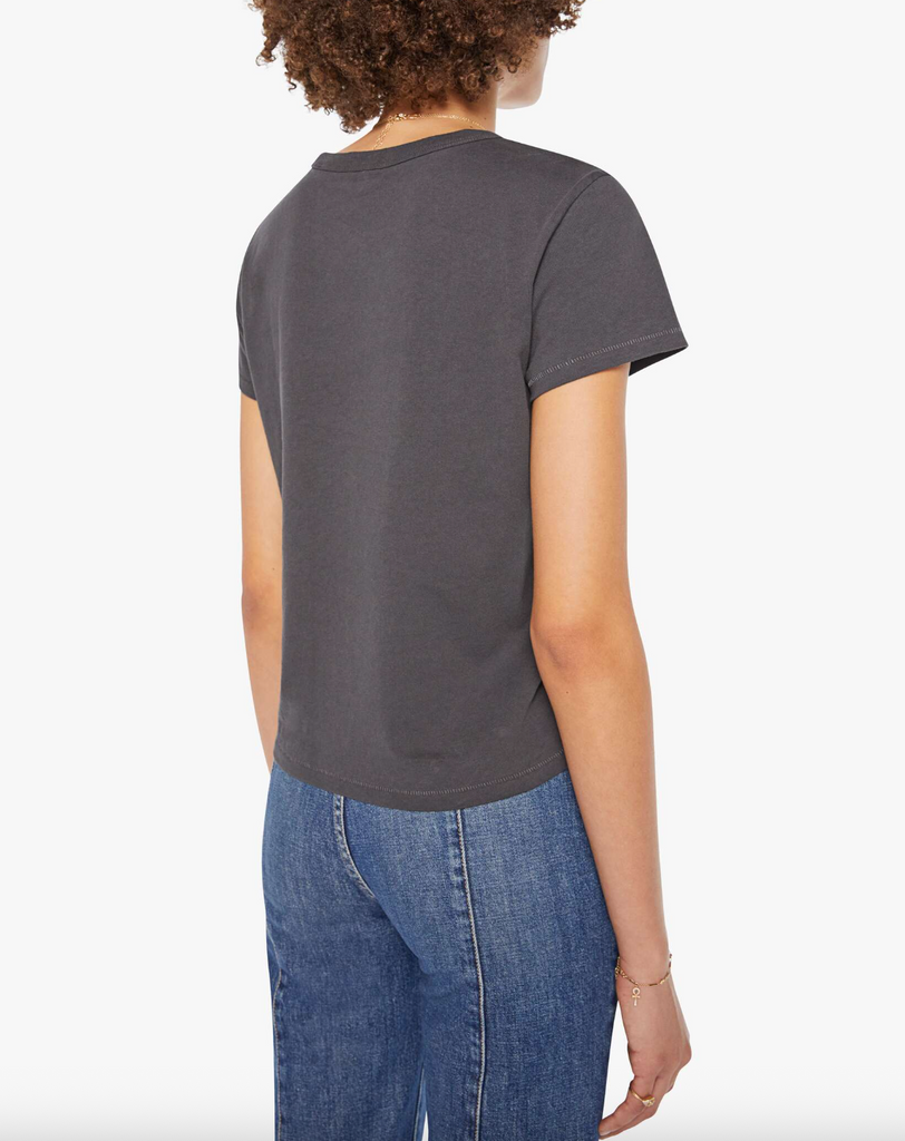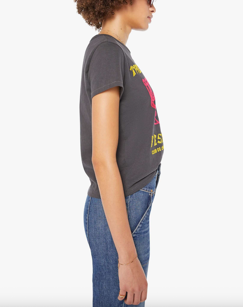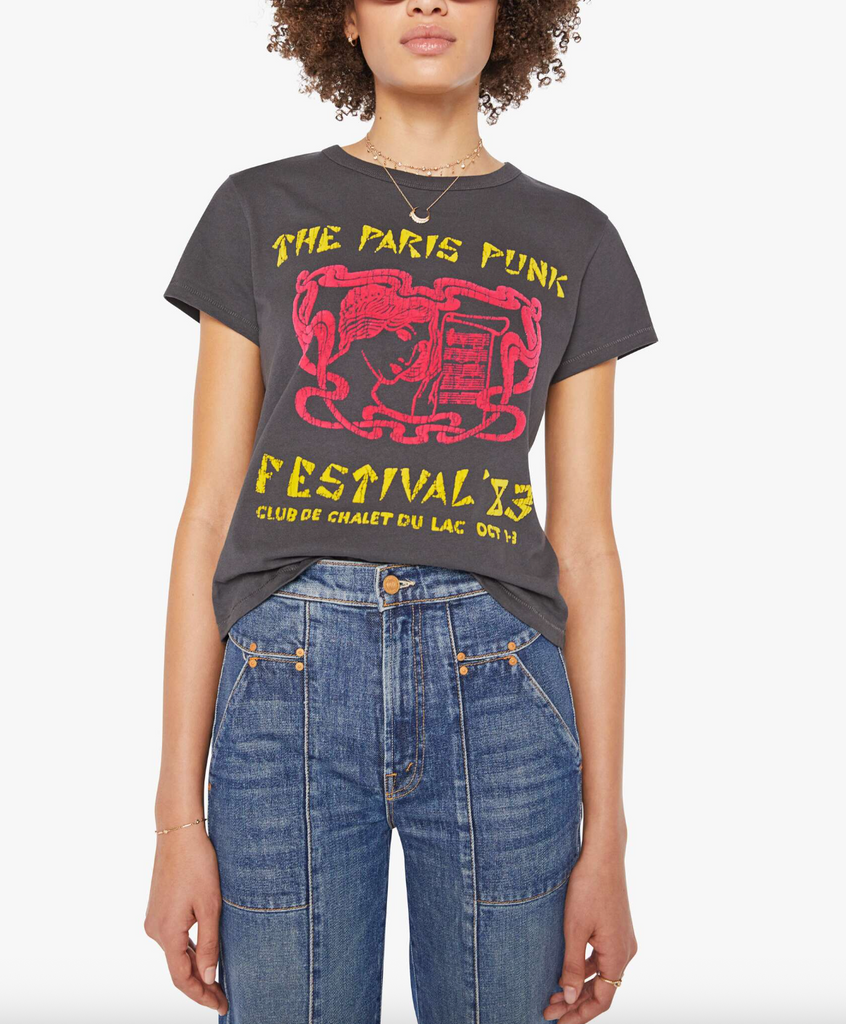 Voyou pour la vie. The Lil Goodie Goodie in Paris Punk is a soft, slightly sheer crewneck with a slim fit for a vintage look and feel. Made from 100% cotton, the faded black tee features a yellow and red text graphic inspired by a punk music festival.