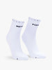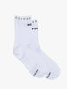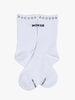 Watch your step. Tube socks with a subtle message from MOTHER. Shown here in white with black text and stud embellishments.