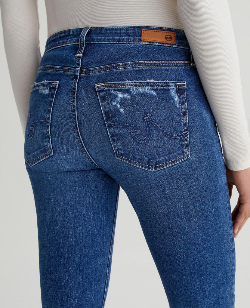 Prima cigarette jeans are featured here in a classic medium blue wash with a vintage fade and distressing at the pockets. Cut from 10 oz. Empower Denim, the style is fitted through the hips with slight tapering at the legs. It's blended with power stretch for a shape-hugging silhouette and premium recovery.