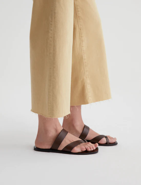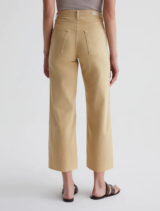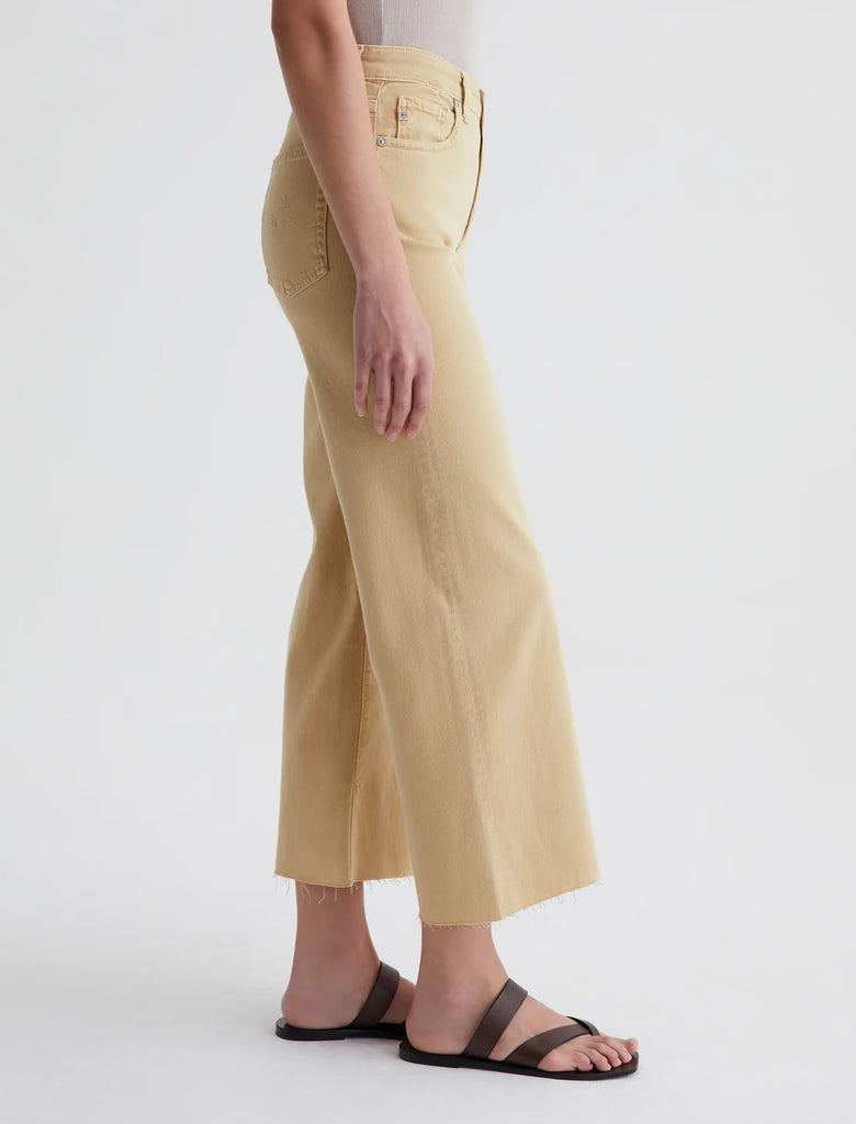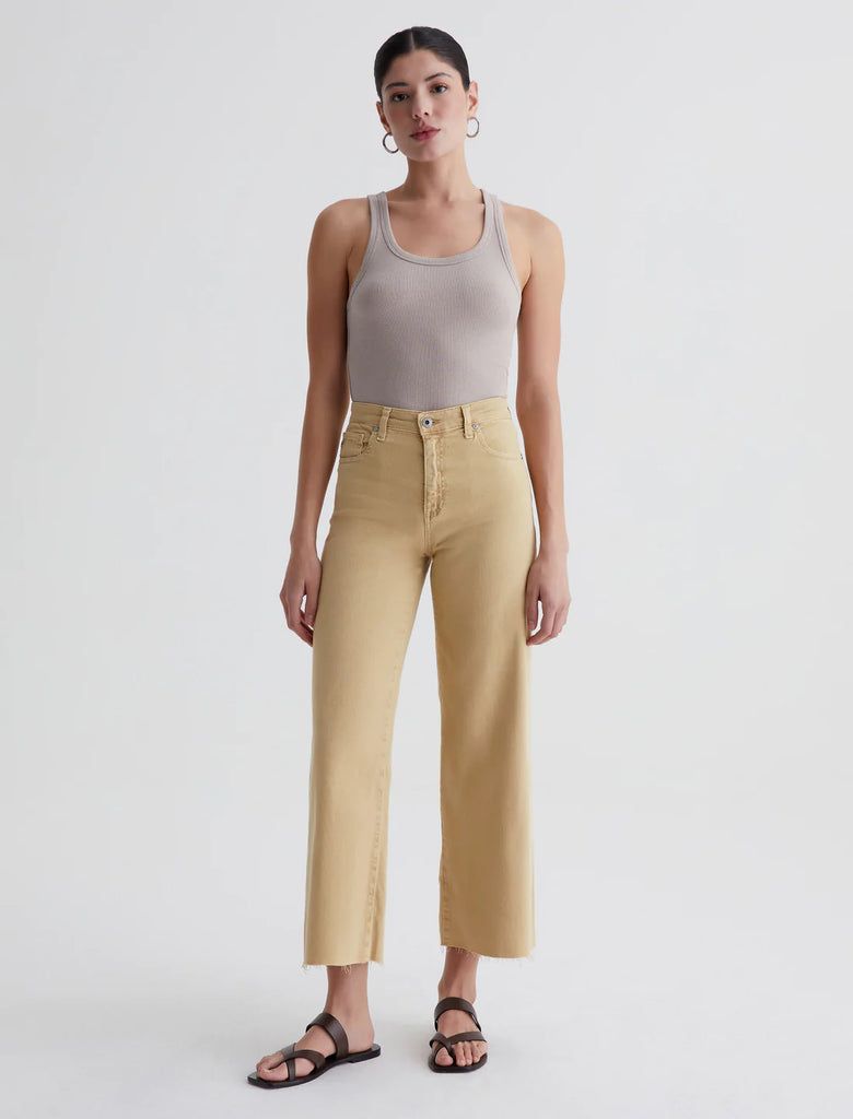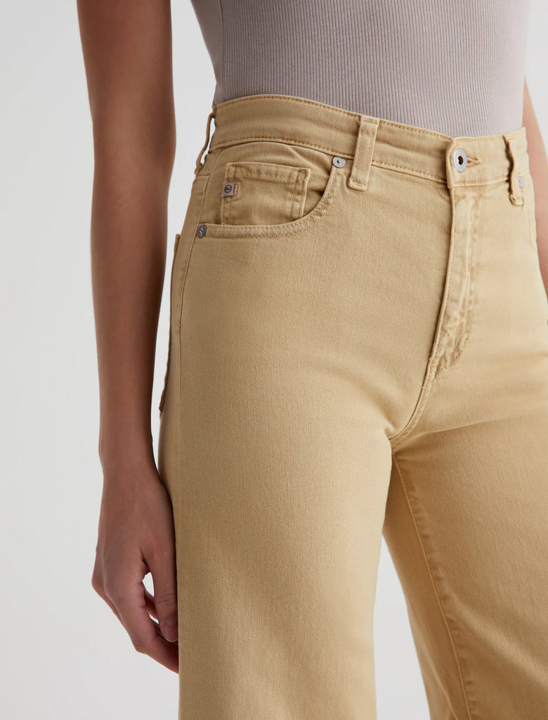 The Saige Wide Leg Crop is a high-rise jean with loose, cropped legs and raw hems. This 5-pocket pair features our 8.7 oz. Hyper-Soft Bull Denim in a sulfur-dyed butter yellow shade. AG Cloud Soft Denim™ fabrics have a special left-hand twill construction, allowing the yarns to gently relax and untwist for a supple feel that gets softer with every wear. Dual-elastic stretch offers extra comfort and a resilient shape.