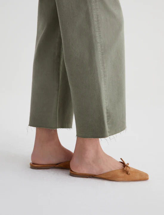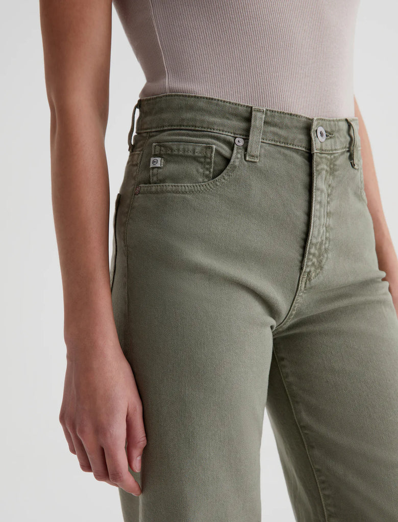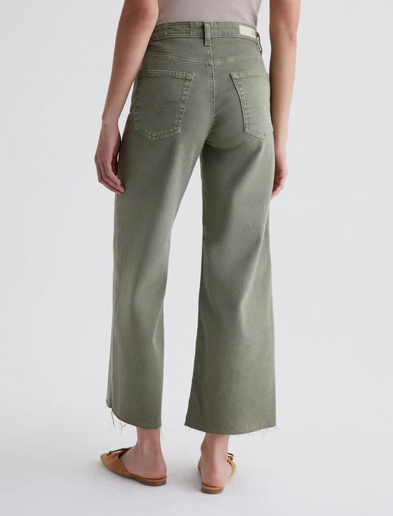 The Saige Wide Leg Crop is a high-rise jean with loose, cropped legs and raw hems. This 5-pocket pair features our 8.7 oz. Hyper-Soft Bull Denim in a faded olive green shade. AG Cloud Soft Denim™ fabrics have a special left-hand twill construction, allowing the yarns to gently relax and untwist for a supple feel that gets softer with every wear. Dual-elastic stretch offers extra comfort and a resilient shape.