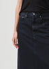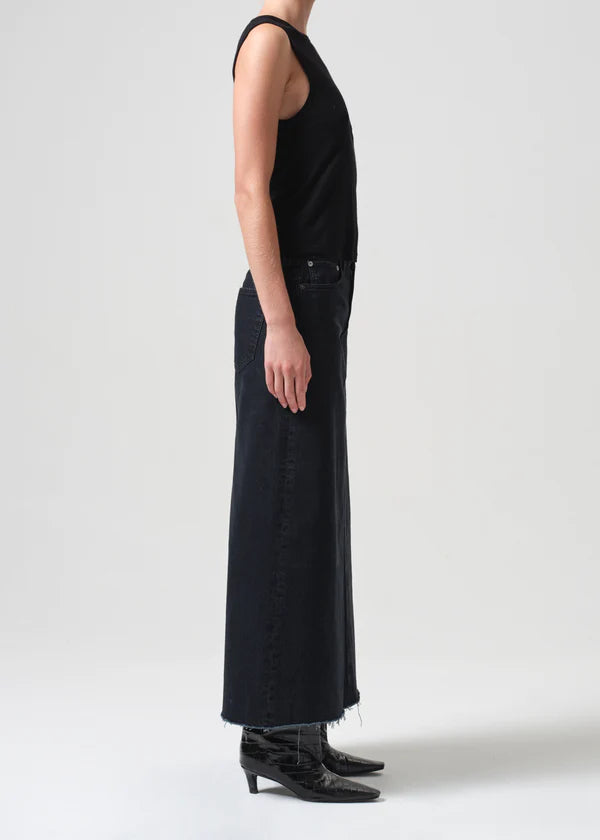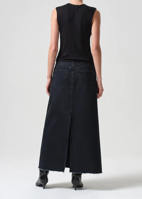 Looks Like: Saturated black, ankle length with a back slit and a raw hem