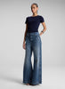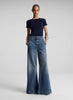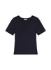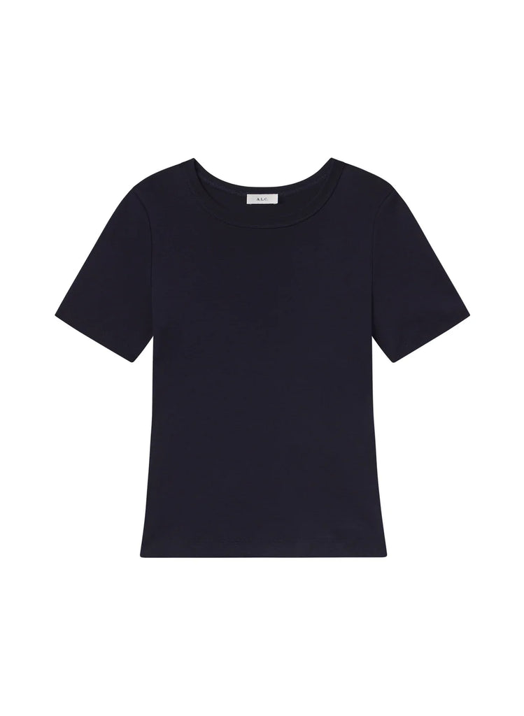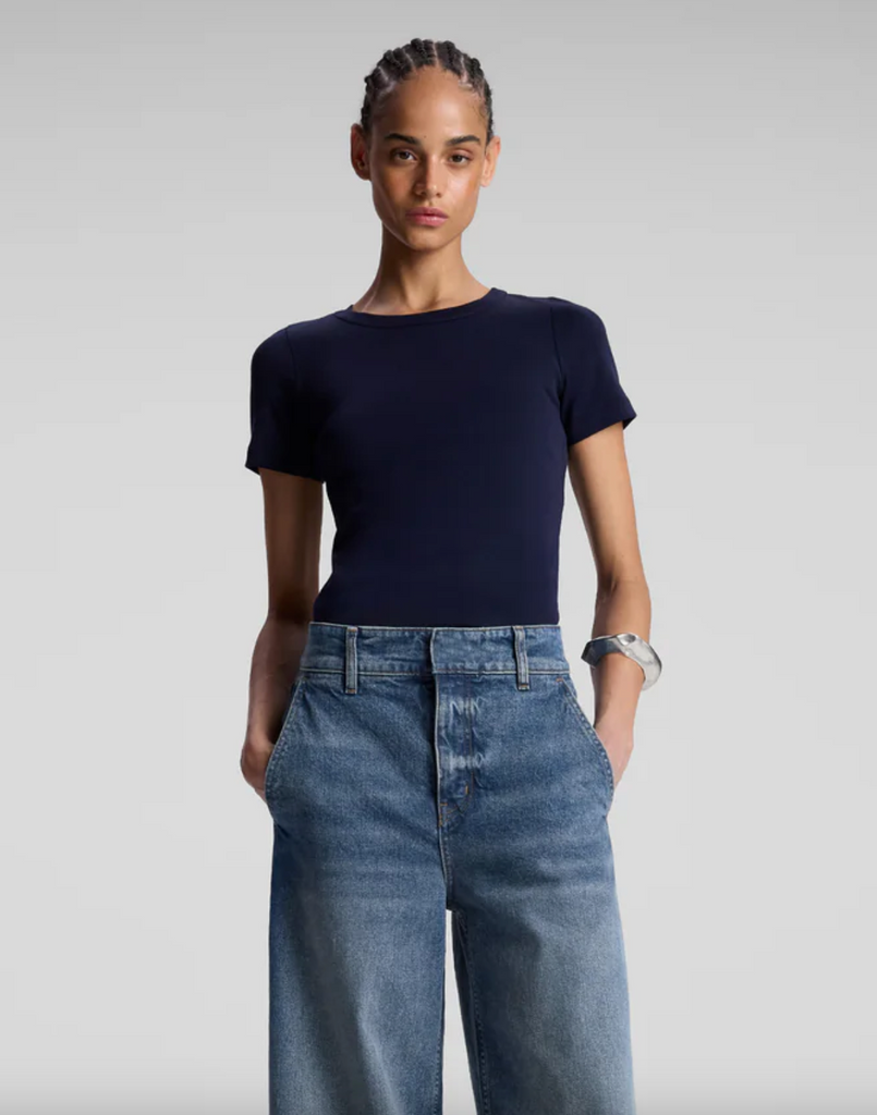 The Paloma Tee is crafted from soft ribbed cotton fabric in a maritime navy hue. This fitted silhouette is a modern staple designed for repeat wear, featuring a crew neckline and cap sleeves.