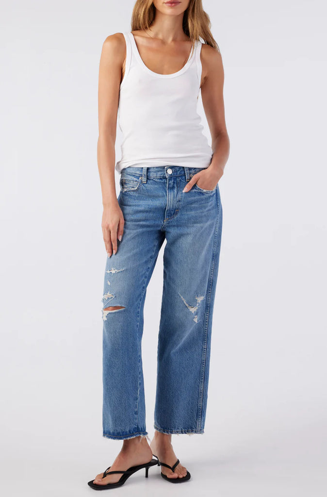 This cropped, wide straight leg is our easiest fit yet. With a mid rise, this pair is meant to sit low on the hips for a relaxed look. Thoughtful distressing throughout. Zip fly.