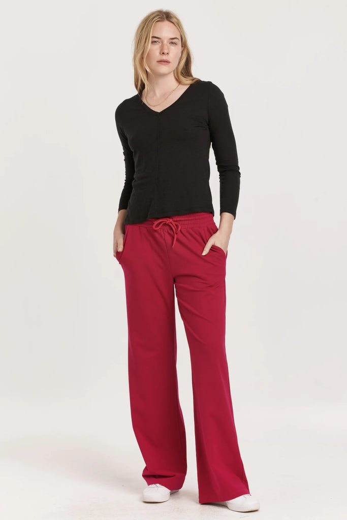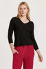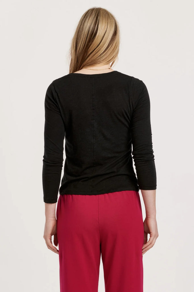 Long sleeve top with v-neck finished in slubby material, front & back center seams. Daily essentials! colorful thread spectrum perfect for any pairing... Solid color knit on standard fit.