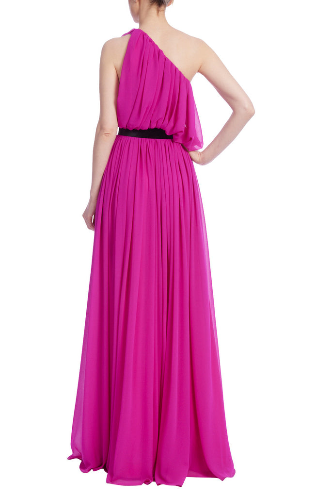 Cut from lightweight Georgette in a vibrant fuchsia hue, this gown drapes with a graceful ease that feels as good as it looks. The one-shoulder design adds a hint of asymmetry, perfectly complemented by a velvet belt that cinches the waist for a flattering, waist-defining fit. The full, floor-sweeping skirt flows with every step, finishing with a dramatic, head-turning silhouette.