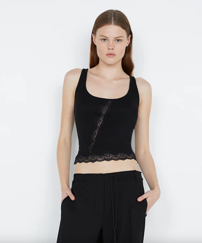 Crafted from comfortable cotton ribbed fabric, the BEC + BRIDGE Amyra Tank is an effortless and versatile top. It features a scoop neckline with a bound top edge and is detailed with a lace trim hemline. A diagonal lace trim runs through the front and back. Styled with BEC + BRIDGE Naida Straight Leg Pant.