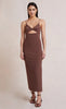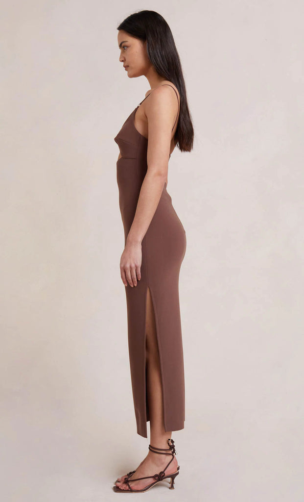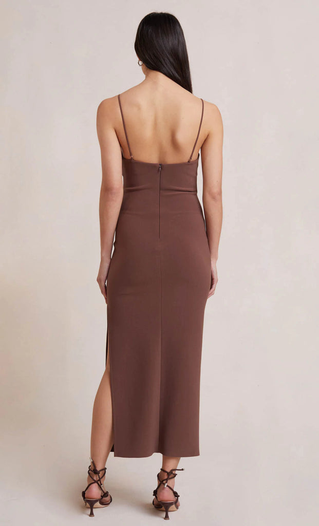 The Ivy Midi Dress is cut from a bonded stretch crepe fabric in a sleek fitted silhouette. This statement style features a twist-front neckline with an underbust cutout detail and side split leg on a midi length skirt.