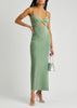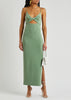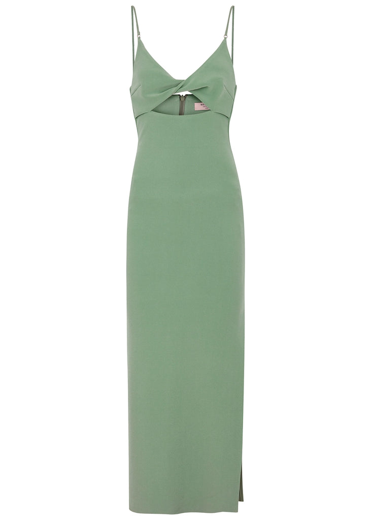 The Ivy Midi Dress is cut from a bonded stretch crepe fabric in a sleek fitted silhouette. This statement style features a twist-front neckline with an underbust cutout detail and side split leg on a midi length skirt.