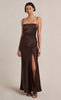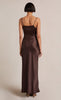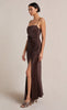 The Nadia Maxi Dress is a flattering bias cut event wear style with a gathered detailing at the waist that disguises any unwanted shapes on the stomach. The maxi dress features a straight neckline with a fitted bust, rouleau straps, and a relaxed flowy skirt with a front split hem.