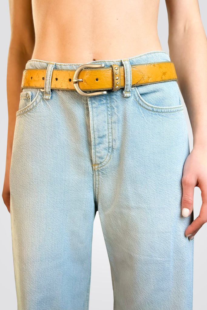 B. Belt belt. Studded belt holder for a statement. Bright color leather.