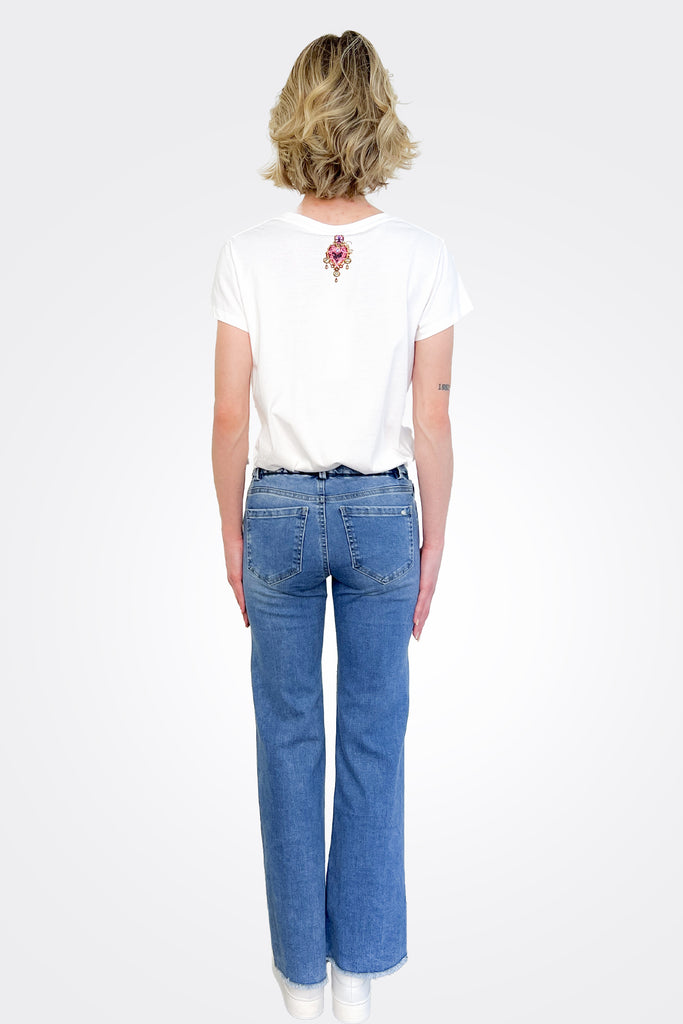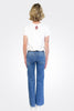 Amanda Light Denim with belt loop and flare, soft fabric. 98% cotton 2% lycra. Machine washable. Does not wrinkle or fade. Comfortable, stylish, very flattering. Wear with sneakers, sandals, booties, heels. Wear it casual or dressy for evening. Try them and you will see why these pants have been the #1 selling item in boutiques all around the U.S. Inseam: 28", Rise: 10"