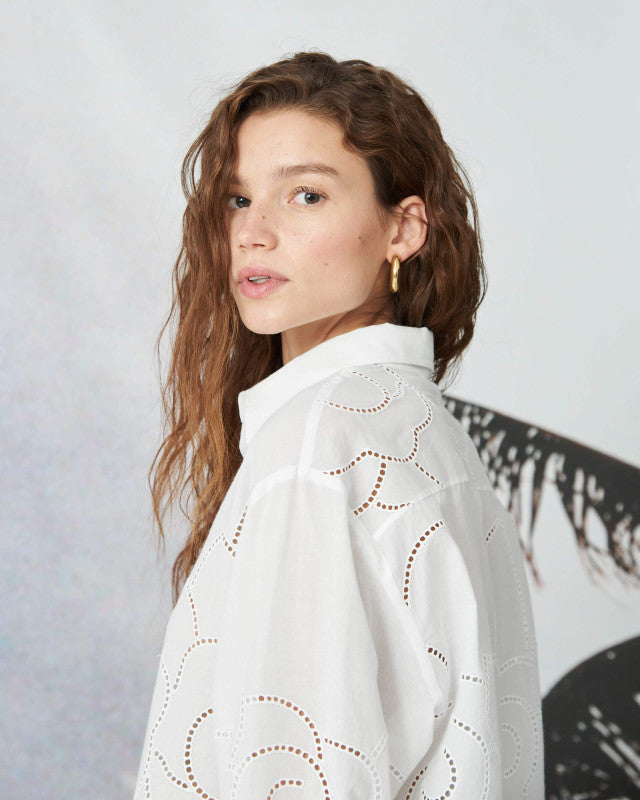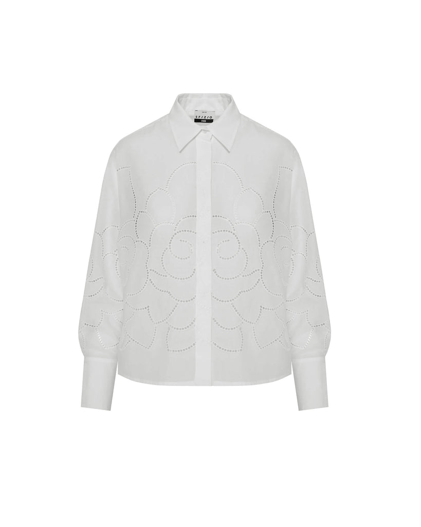 Embellished by the cotton fabric with à jour floral embroidery, this openwork shirt features a regular fit with concealed buttoning, traditional collar, long sleeves with cuffs and back yoke. Made in Italy.