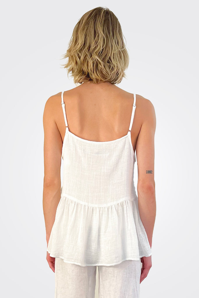 Cotton blend. Imported. Hand wash recommended. Adjustable shoulder straps. Gauze fabric with flowy silhouette.