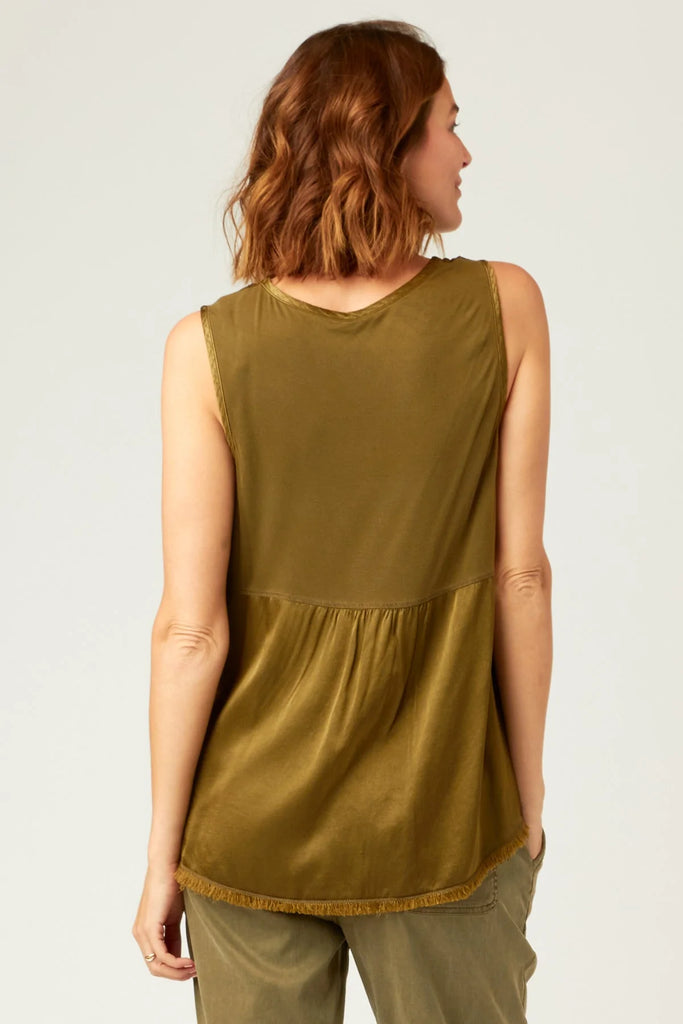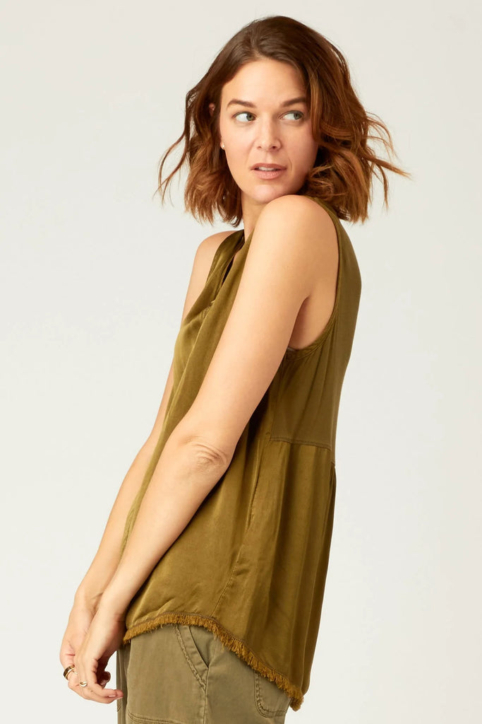 We love a classic satin top and Rayden has all the components to be a top dog. Traditional tank shape with forward angled side seams, raw edge details and contrast knit back, this dressy little thing will be layering under all your favorite pieces!