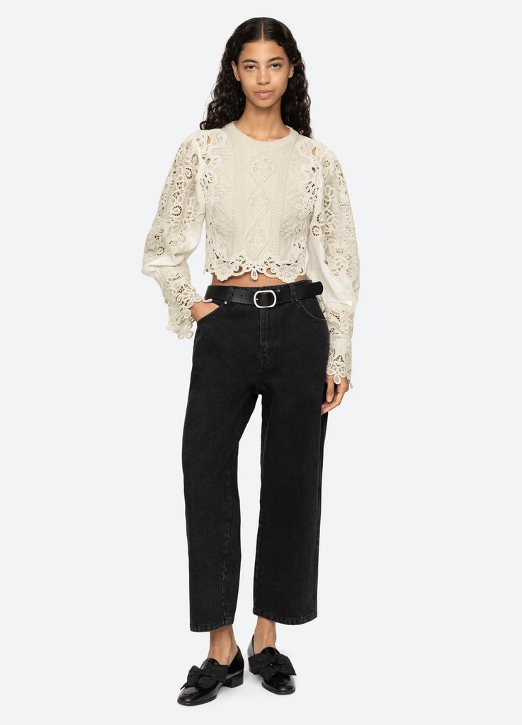 The Vania lace combo sweater blends modern elegance with vintage-charm, featuring a cable knit body framed by sheer lace sleeves. The cropped silhouette lends a contemporary finish to this polished style.