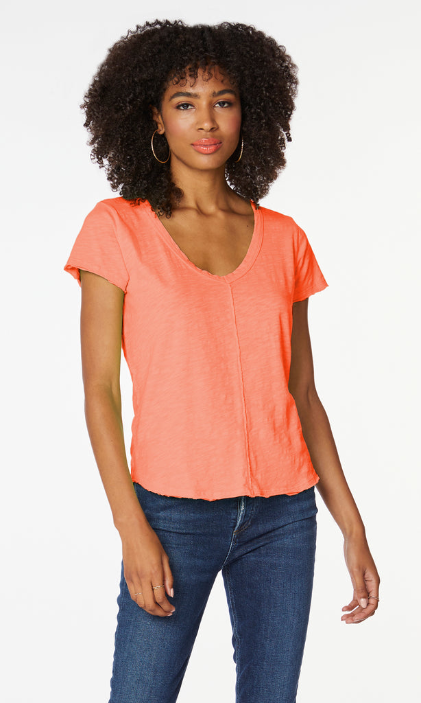 This classic V-neck tee was given a new look with raw edges at the sleeve, hem, and down the front center seam.