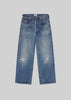 Looks Like: Dark to medium indigo denim with slight diestressing at the knee and a raw hem