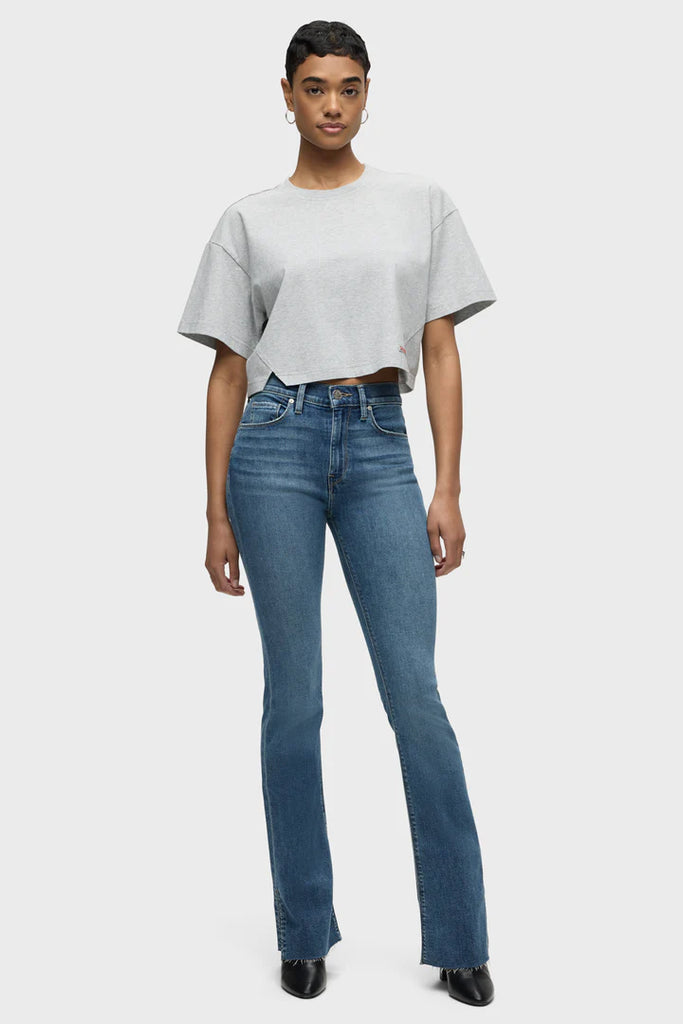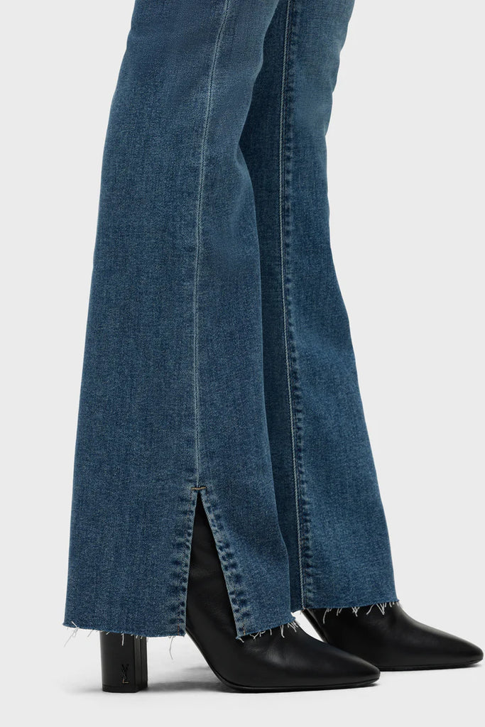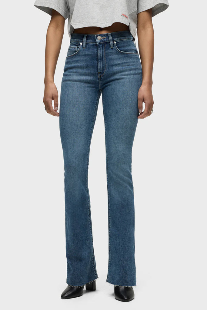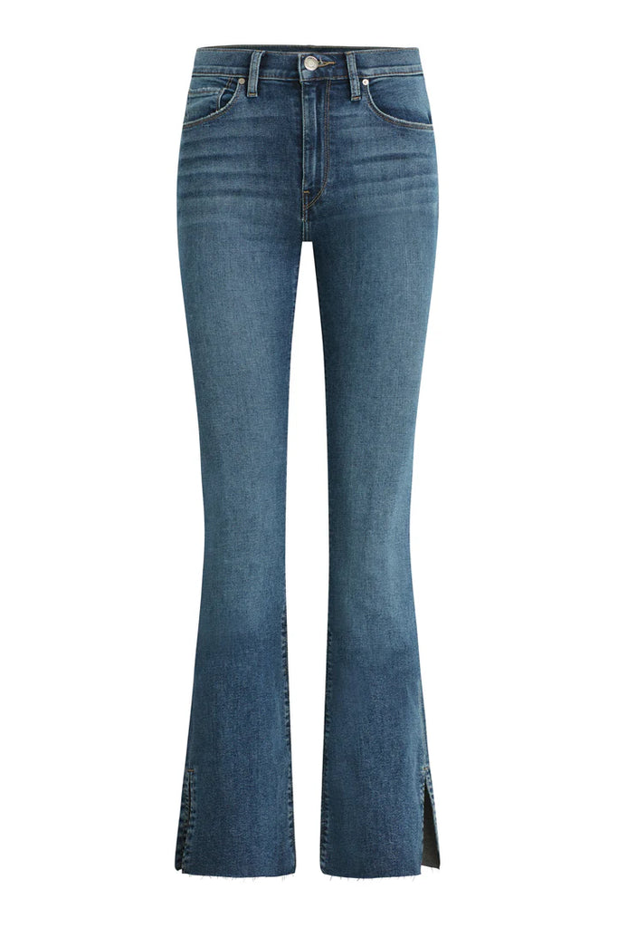 Streamlined and flattering, our Barbara High-Rise Bootcut Jean in medium blue Palace is cut for a slim, contoured fit with an elevated waistline and a gently flared leg. Made from premium stretch denim, it’s finished with grinding along the edges, raw hems and outseam slits.