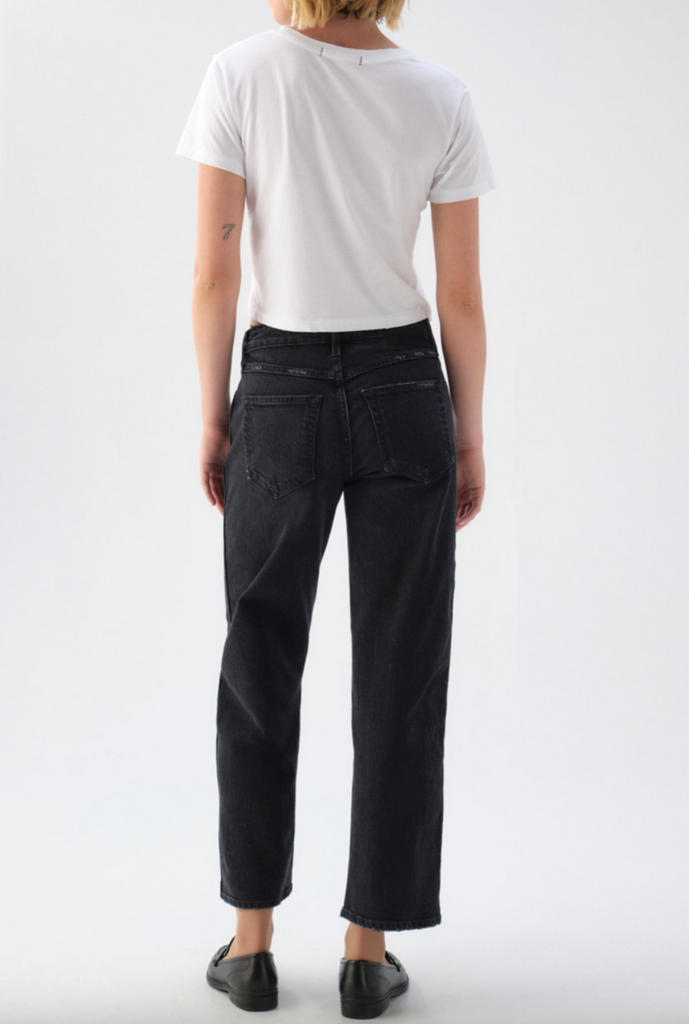 This cropped, wide straight leg is our easiest fit yet. With a mid rise, this pair is meant to sit low on the hips for a relaxed look. Thoughtful distressing throughout. Zip fly.