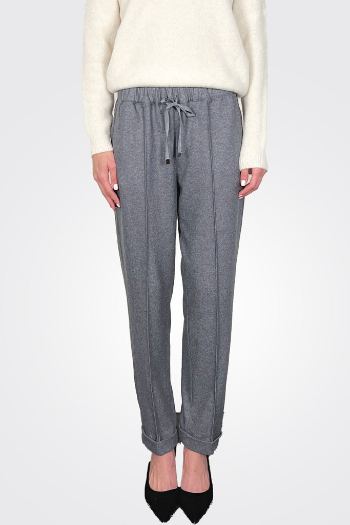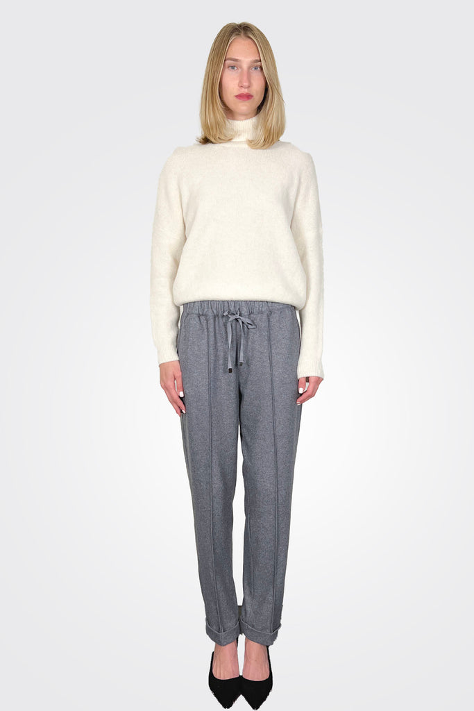 JOGGER TROUSERS IN LIGHT CASHMERE CLOTH. ELASTICATED WAIST WITH ADJUSTABLE DRAWSTRING, SIDE POCKETS AND TURN-UP ANKLE CUFFS. RELAXED, TAPERED FIT, ANKLE LENGTH.