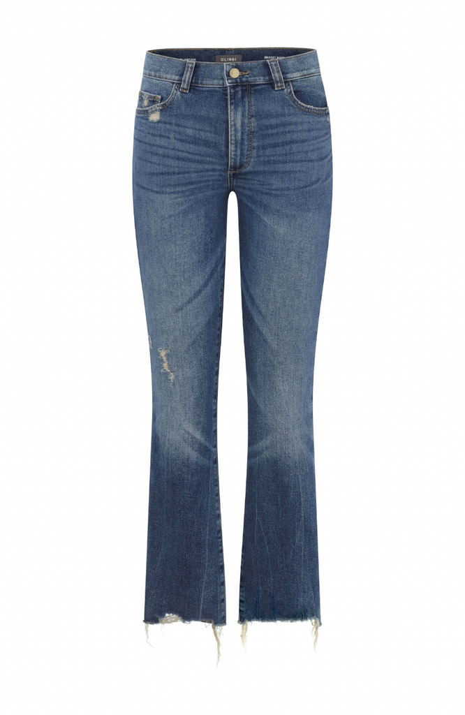 Adams is a vintage mid-indigo with small distressing throughout. It features khaki stitching, brushed gold hardware and a raw hem with natural fray.