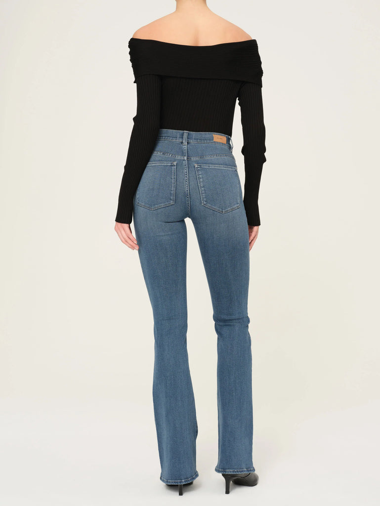 Vail is a soft mid-indigo wash with subtle fading. It features shiny silver hardware, multi-colored stitching, clean hem and brown back patch.