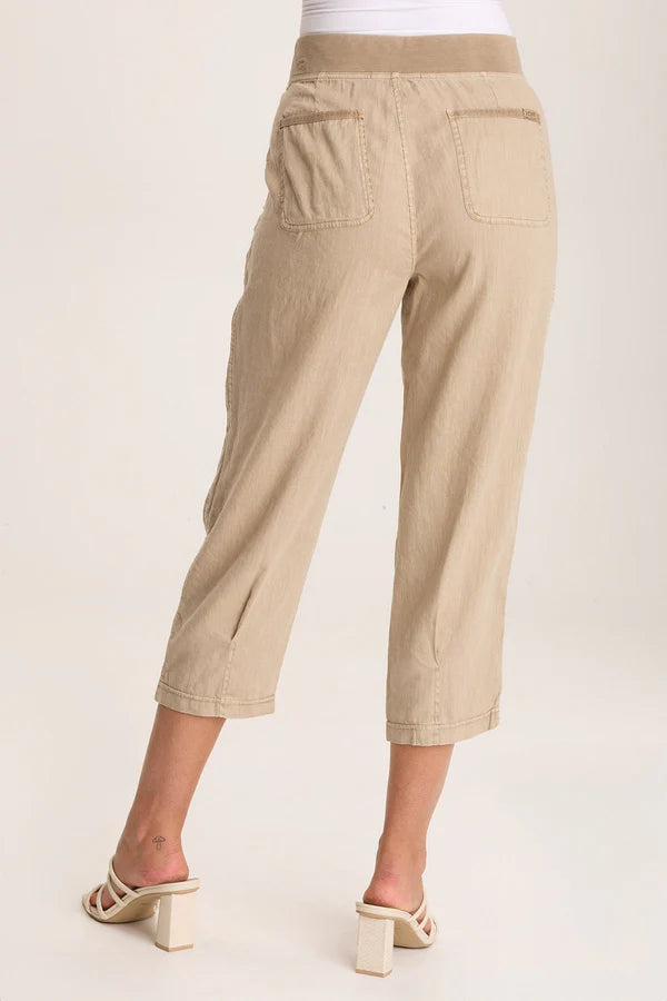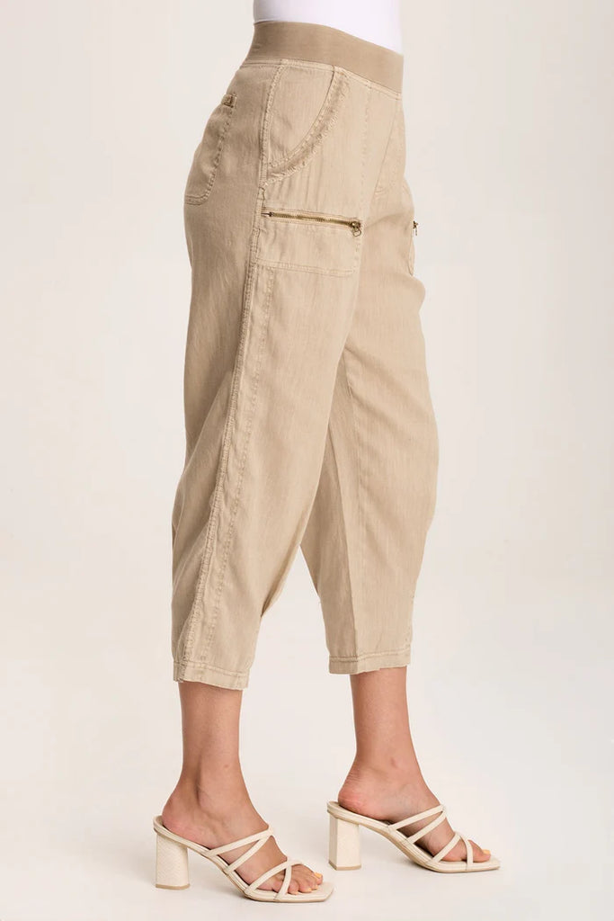 A gentle single pleat on either leg creates a unique tapered look on this capri style, featuring a pull-on elastic waist and zippered front pockets for maximum utility.