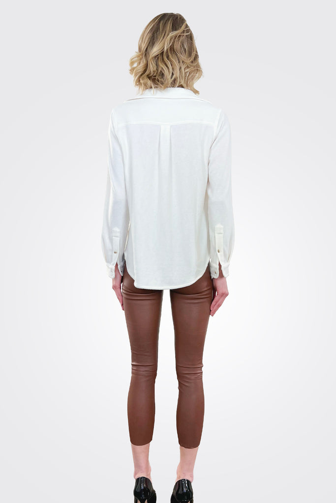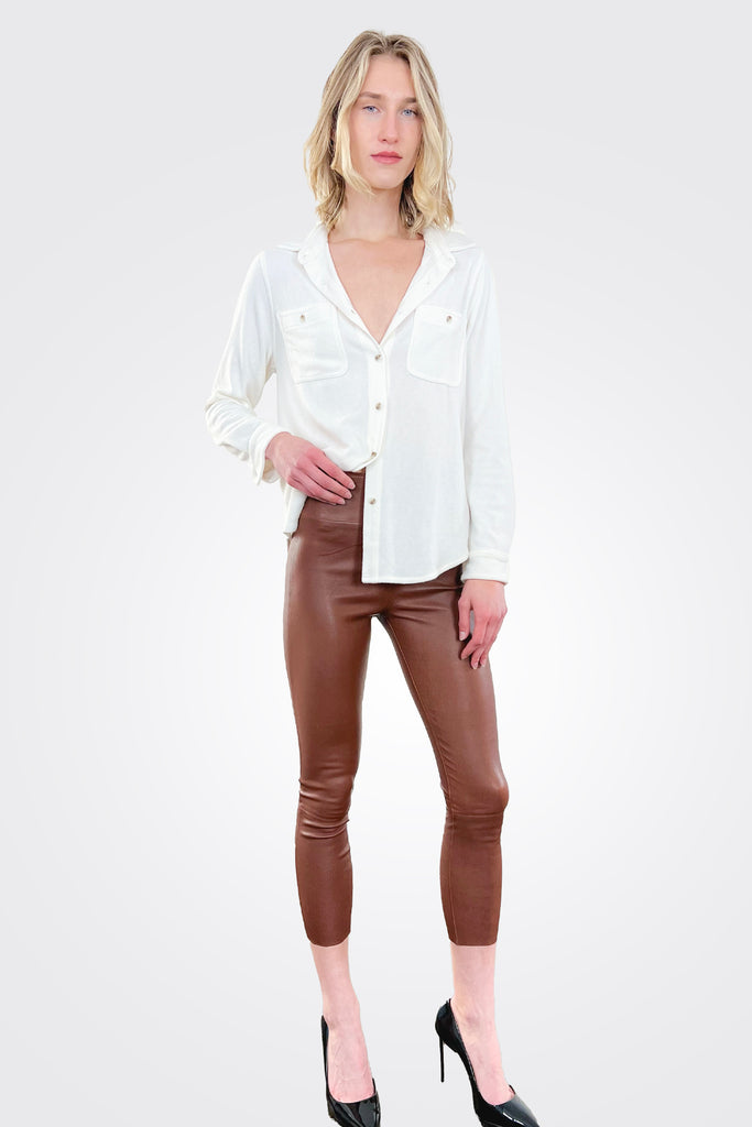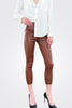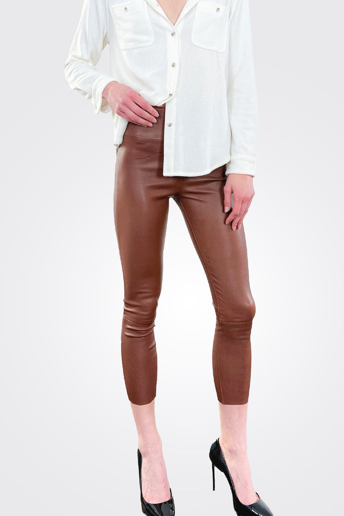 High-waisted cognac leather Capri leggings. Stretch Leather. Pull on leggings with elastic waistband. Raw hem.