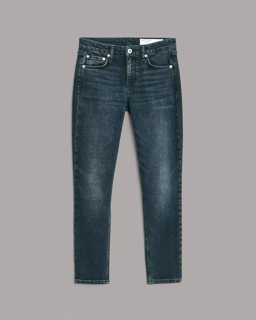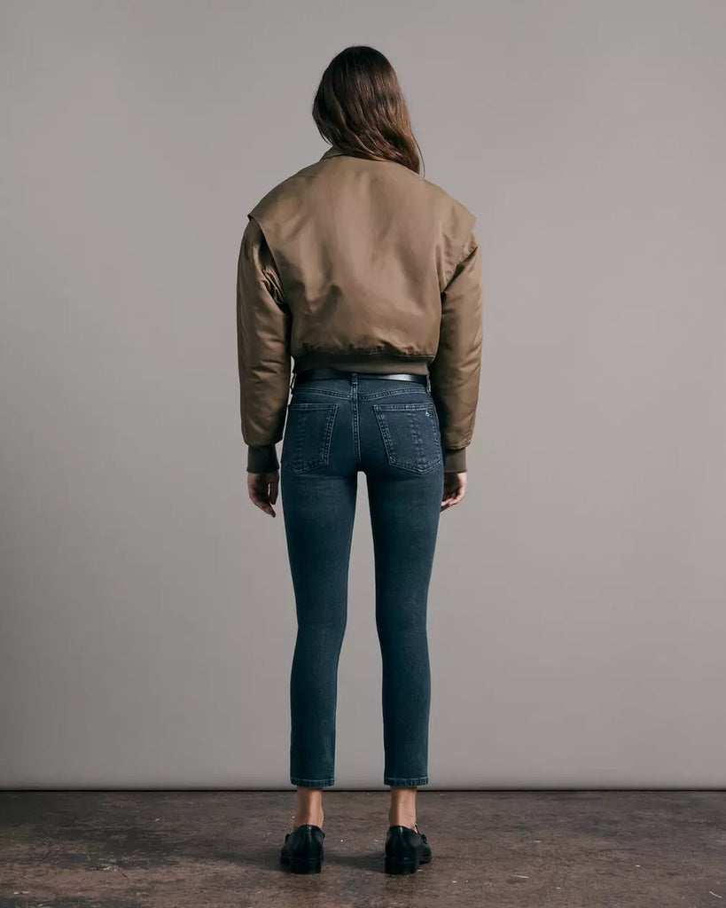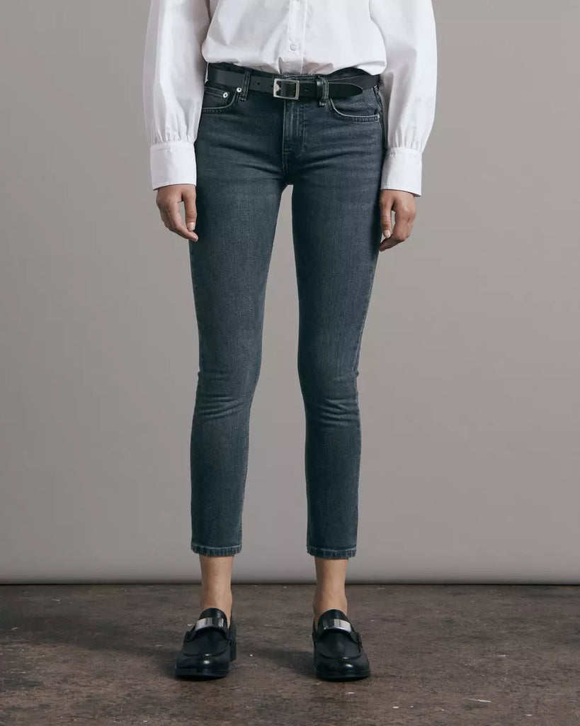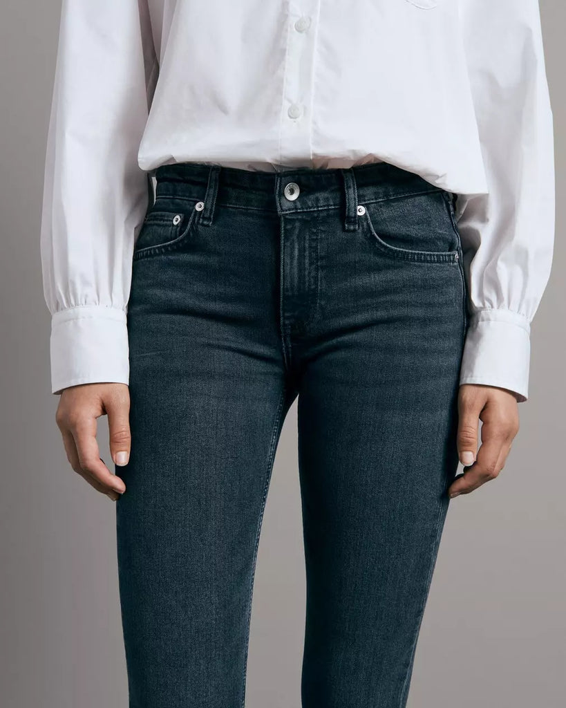 Cate is our mid-rise jean, perfected. Slim through the hip and thigh with a skinny leg and ideal ankle crop. Sits at the natural waist. Available in Dekalb, our black wash.