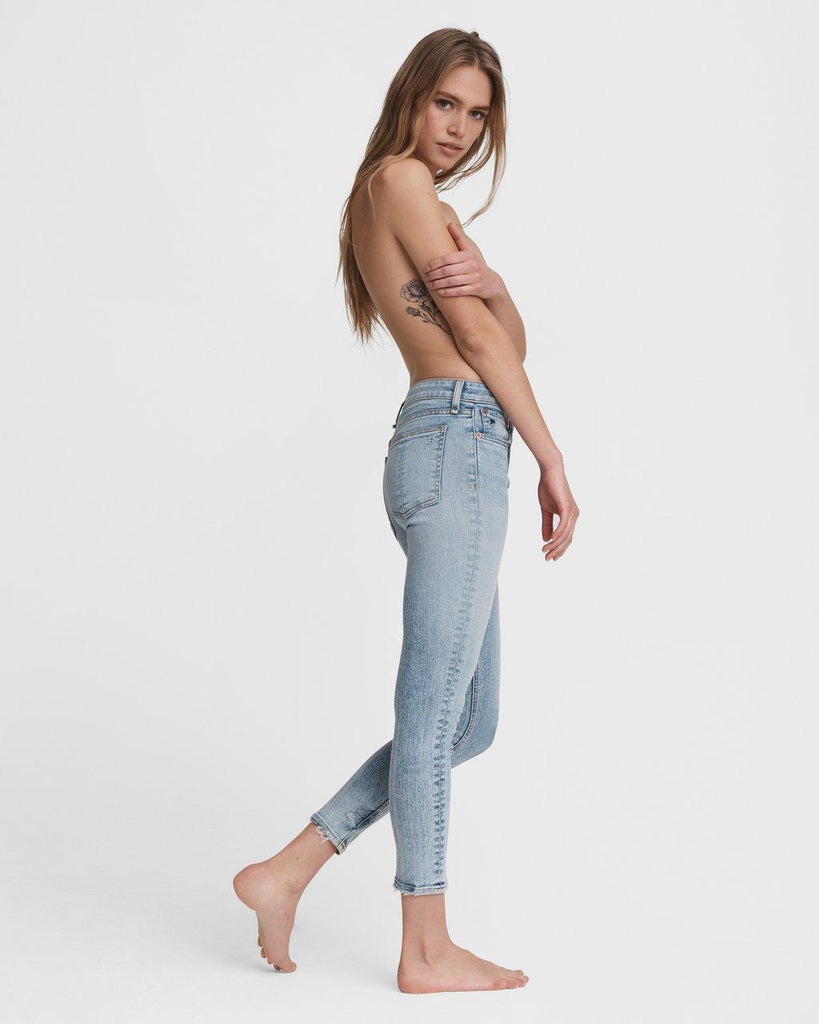 Stella is a light acid washed Japanese stretch denim cut in rag & bone's iconic Cate: our perfected mid-rise silhouette. Sitting at the natural waist, Cate is slim through the hip and thigh with a skinny leg and ideal ankle crop. Features a zip fly and a specialty hem.