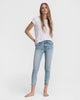 Mid-rise ankle skinny, sits above hip, slim through hip, thigh, and leg
