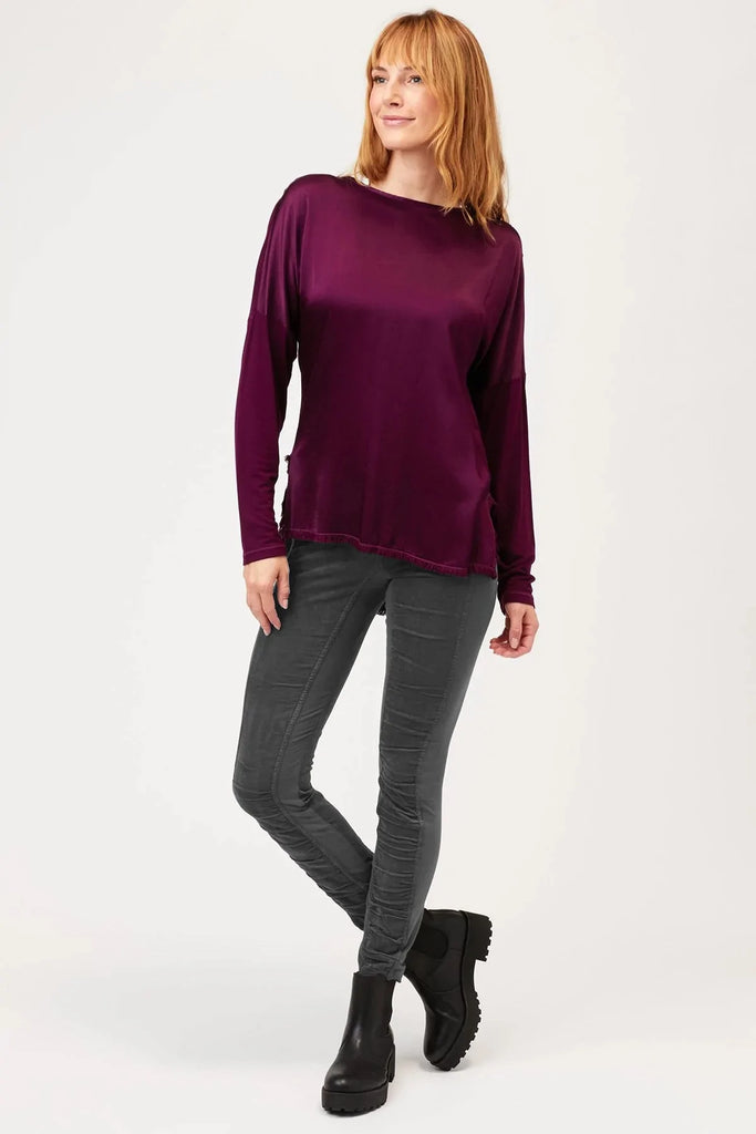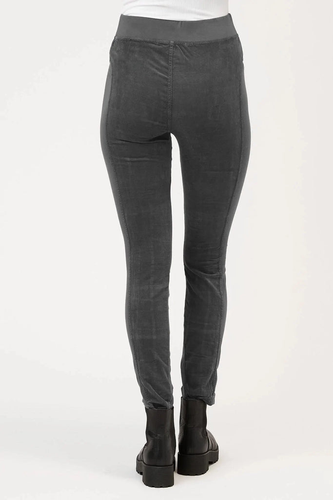 The most popular long legging - in Stretch Corduroy, is now with a higher rise, and a 2" elastic for a pull-on waist - features ruching on front leg from hem to knee, and jersey inserts on sides for a cozy fit.