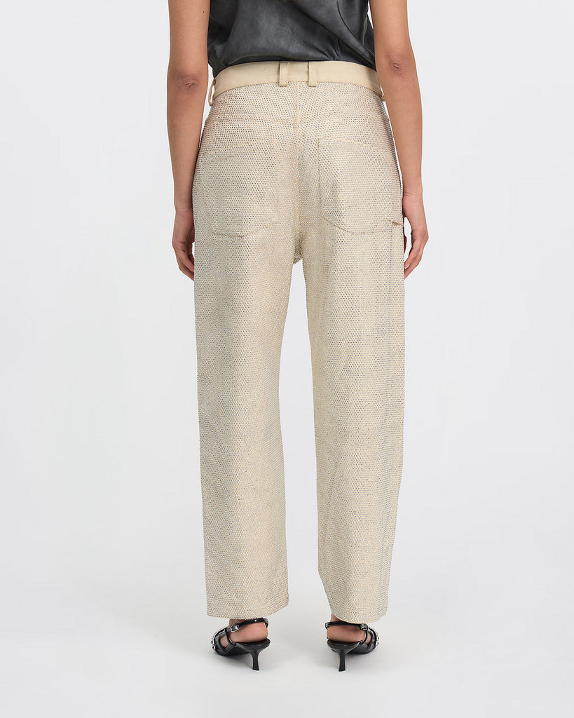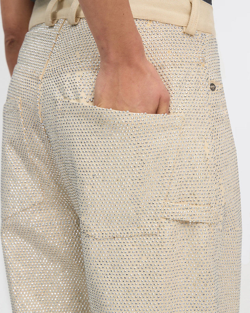ivory denim pants are embellished with silver micro rhinestones, adding a touch of shine and subtlety.