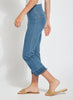 The Daria Gradient Hem Denim showcases a cropped, bootcut leg, pin tucks below the knee, back patch pockets, and a unique, gradient hem with fringe. Offering a concealed patented waistband – and fashioned from stretchy Knit Denim – these jean crops provide a flattering and comfortable fit.