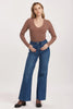 High rise wide leg jeans. It's cozy fit that sits at natural waist, embraces your natural curves and accentuates your hips and thigh. Full inseam on comfort stretch denim accented with hand sanding hip whiskers, tailor pressed seam lines, cut-off hem details.
