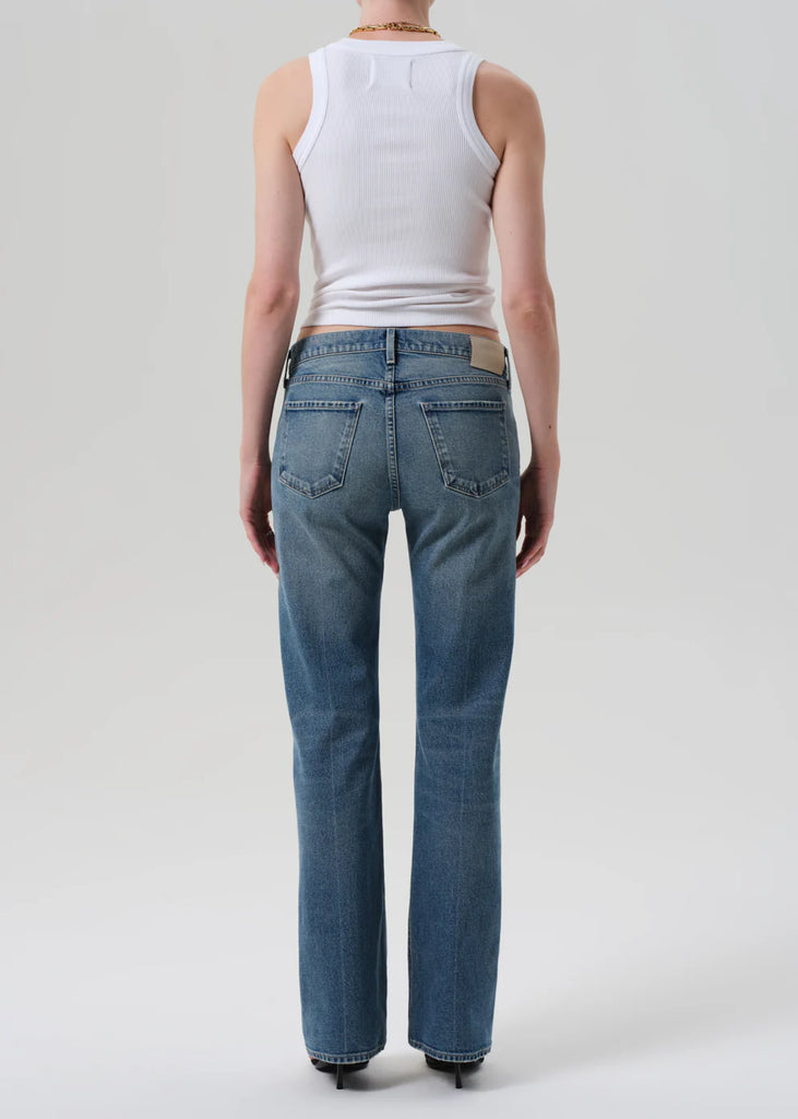 The Genova is a low-rise bootcut silhouette designed to elongate and flatter. Crafted from Japanese comfort stretch denim with a soft, broken-in hand, it offers structure with subtle flexibility. The Clairo wash—a medium indigo with gentle fading and whiskering—adds a timeless, lived-in finish. The versatile full-length leg pairs effortlessly with any kind of shoe—from boots to sneakers to heels.