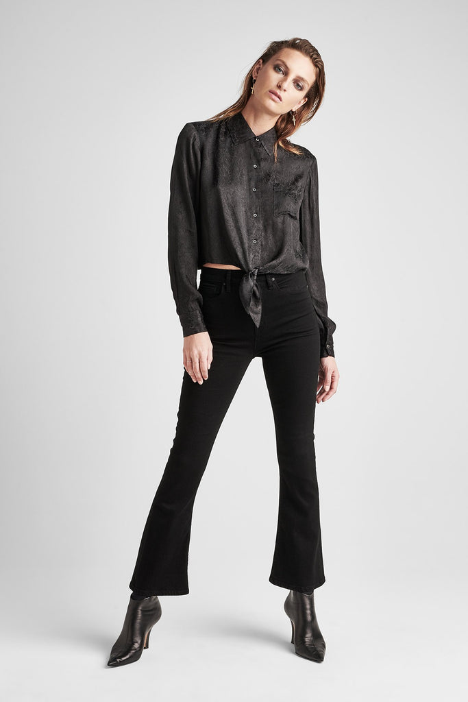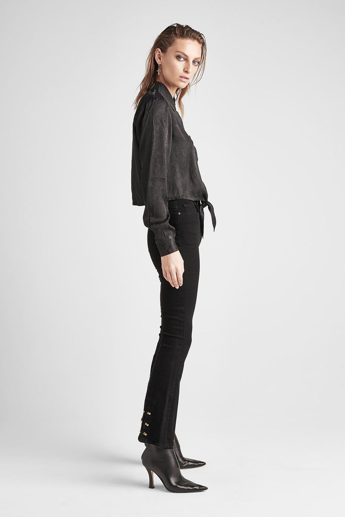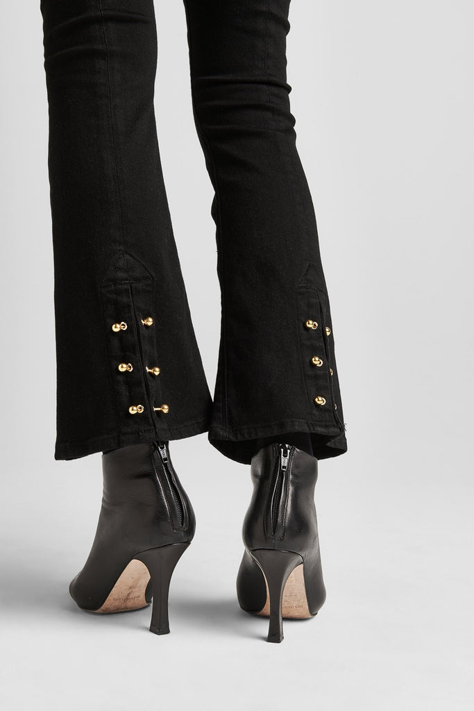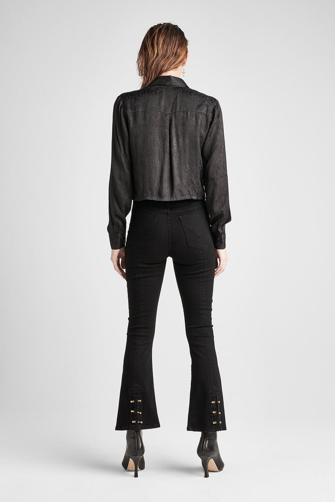 The Holly High Rise Crop Flare is a 5 Pocket jean featuring a comfortable high rise, a cropped inseam and a fitted flare leg block that breaks at the knee. Channeling your inner punk princess, Hudson added a piercing detail with gold curved barbells, joining grommets at the back hem.