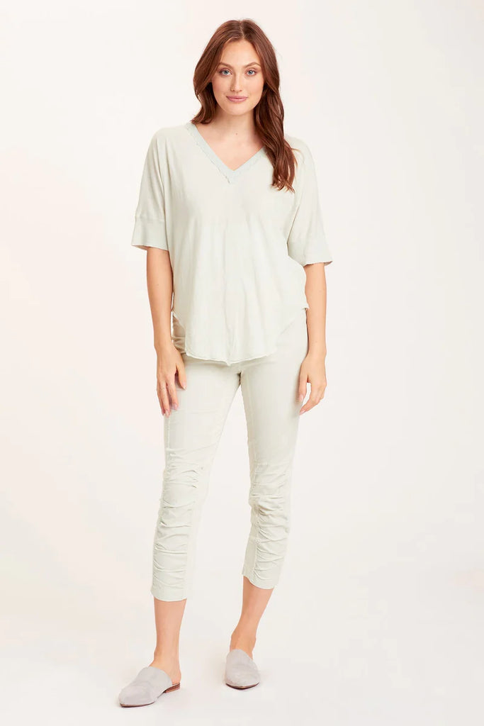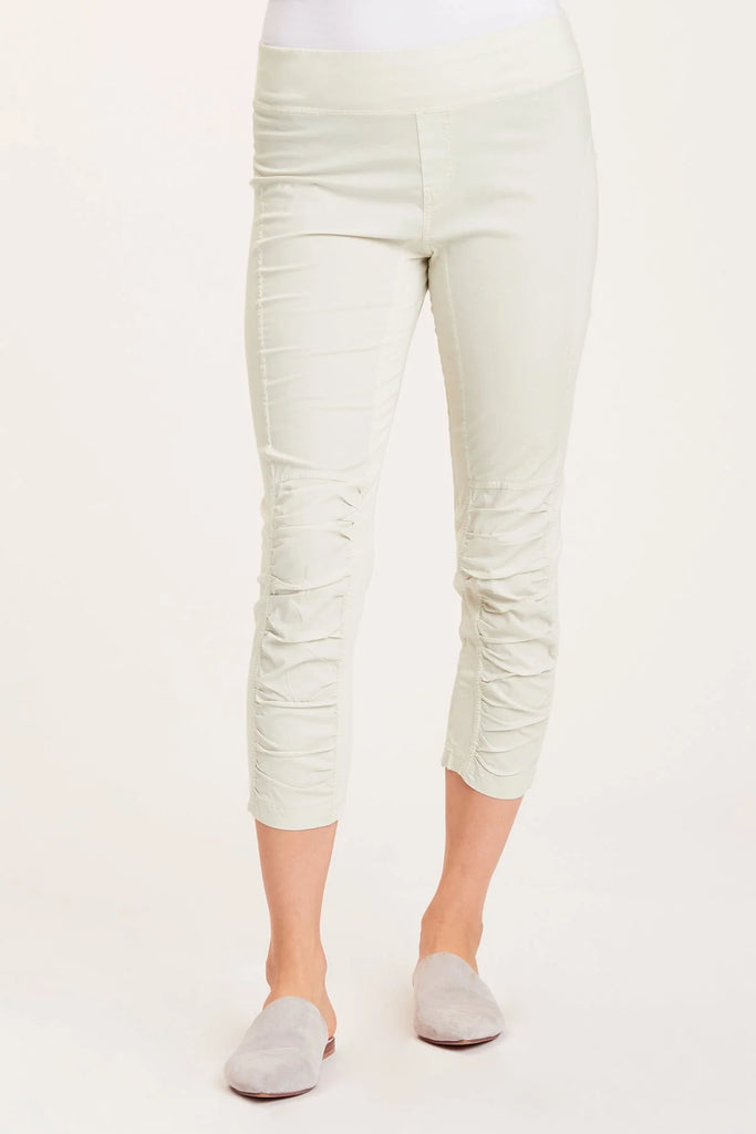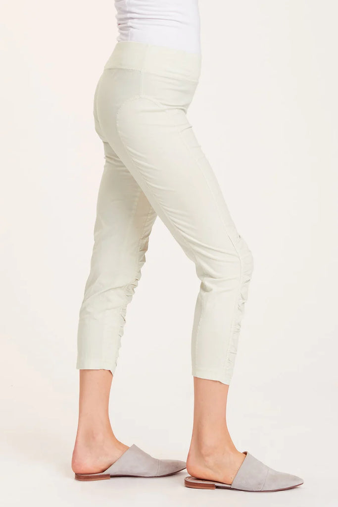This classic and an all-time favorite legging features a pull-on elastic waistband, jersey side inserts at side leg for an impeccable fit, and rouching at leg bottom.