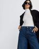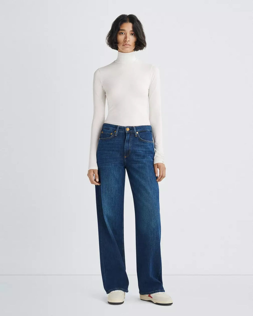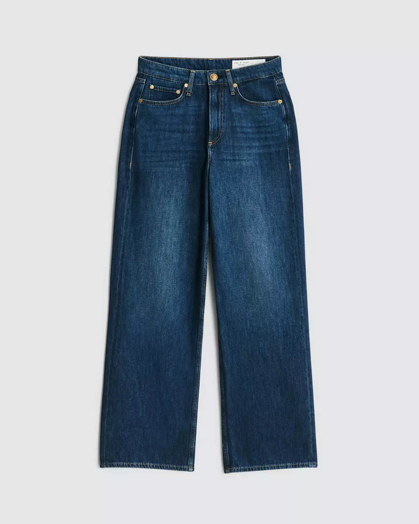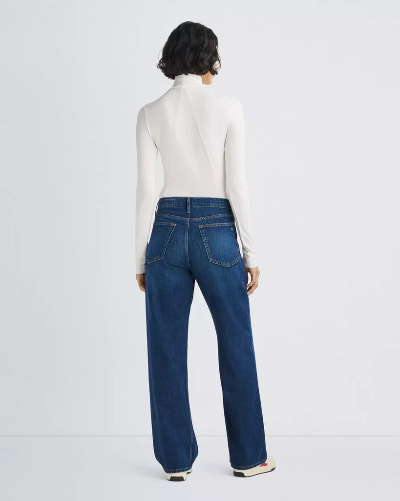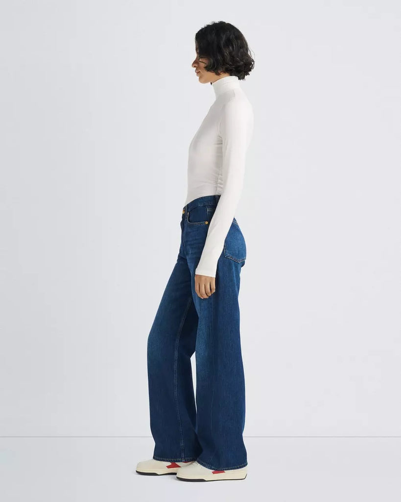 The Logan. A wide-leg jean with a relaxed fit. Crafted in raw denim to fade and crease as your body moves through life. In Annelise, a dark indigo wash with a clean hem.