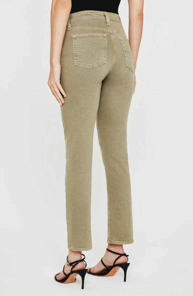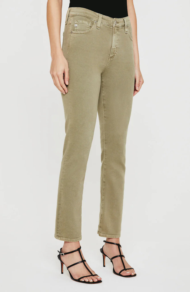 Mari Crop is a high-rise straight leg jean for women, updated in a cropped length and a subdued green color. The style has a flattering high-rise waist and fits easy around the hips with a straight leg and slim leg opening. This women’s high-rise jean is designed i8.7 oz. Hyper Soft Bull Denim, AG's special left-hand twill fabric that allows the yarns to gently relax and untwist for a luxe, supple feel. It's designed to get even softer the more you wear it. Dual-elastic stretch offers extra comfort and a resilient shape.