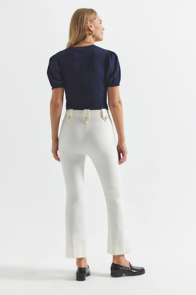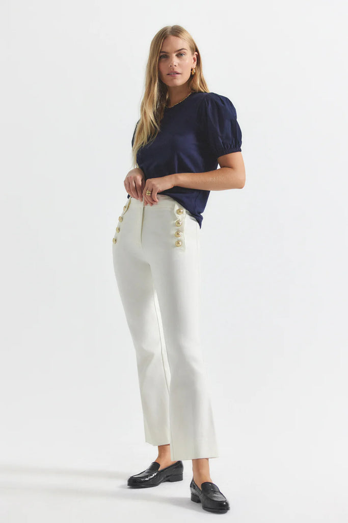 The iconic cropped twill trouser with gold sailor button details along the hips. Zip fly with button closure, flat front, tonal buttoned belt loops and stitching.