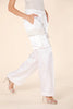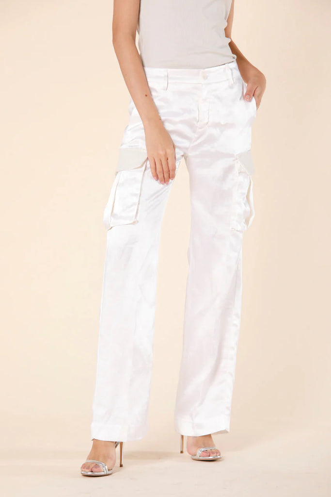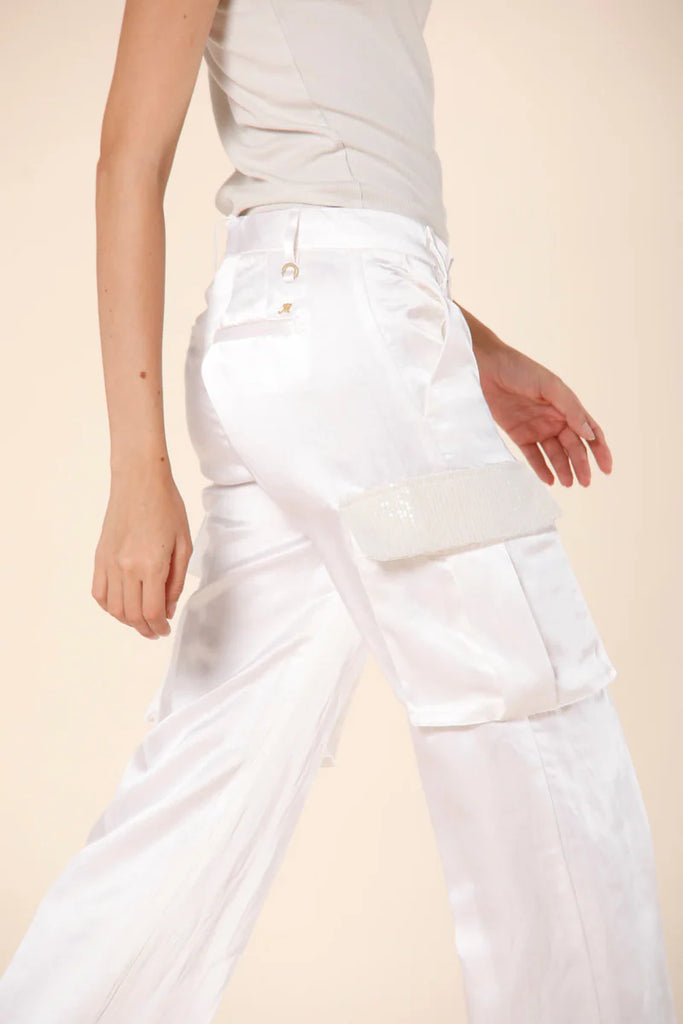 Wear the Women's Victoria cargo pants by Mason's, in a regular fit made of luxurious satin in a cream shade. These cargo pants combine the elegance of a straight and soft silhouette with the functionality of sequin-enriched cargo pockets.