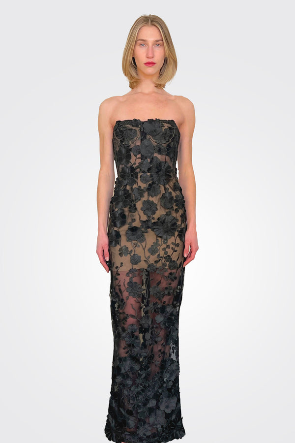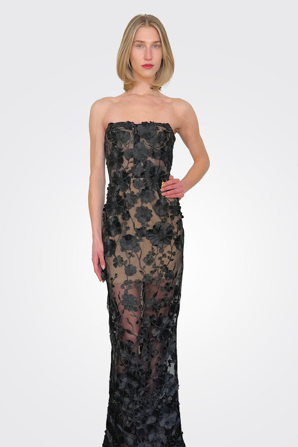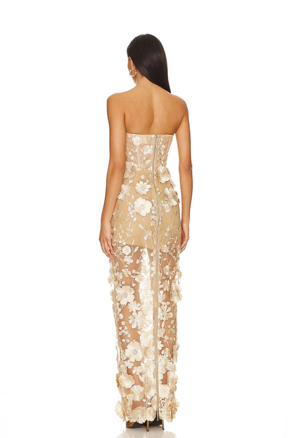 For those seeking a touch of drama, the Sicilia High-Low Ruffle Floral Lace Gown offers a bold statement with its voluminous ruffles and delicate lace. Available in sizes ranging from S to XL, it ensures a perfect fit for every body type.