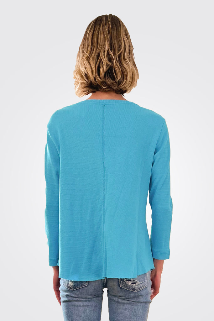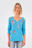 The Lara Top is long sleeved with a notched neckline and multi-colored embroidery.