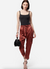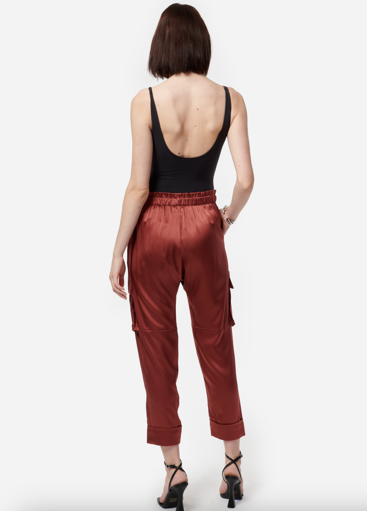 Carmen is a sophisticated twist on the classic cargo pant, and one of our most loved customer favorites! This stretch silk sandwash charmeuse pant features an elasticated waistband with a functional self-tie and ruffle detailing at the top edge, combining comfort with an elevated style. The Carmen is a cropped length pant with a rolled cuff and is finished with side cargo pockets with a flap closure. Versatile and comfortable, the Carmen is the silk trouser that will take you from day to night, desk to restaurant.