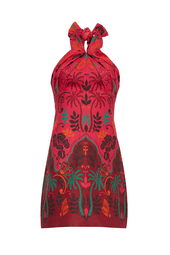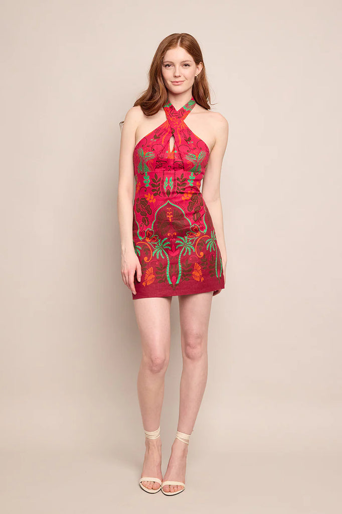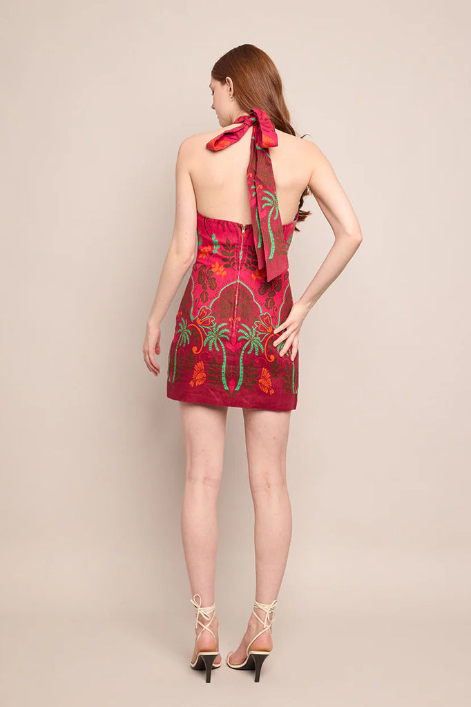 • Open back mini dress featuring a draped bodice with criss-cross halter neck that extends into self ties