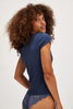 Features: Ribbed swit fabrication, crew neckline, button-front closure, capped sleeves, picot trim