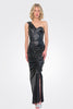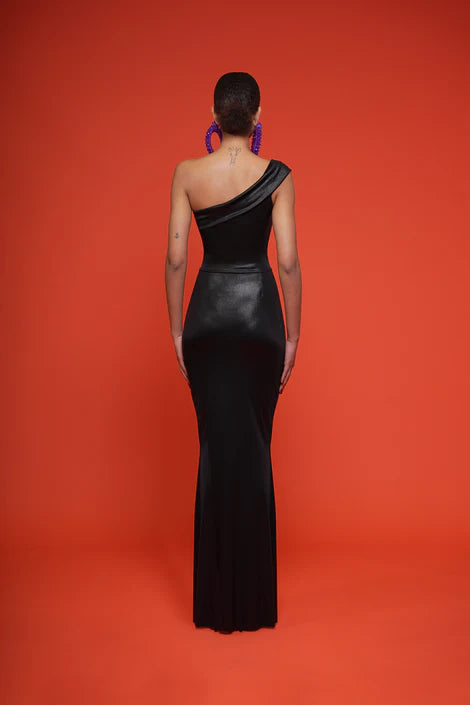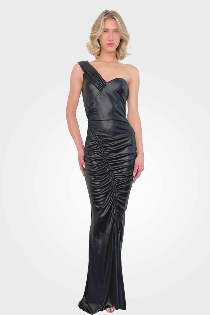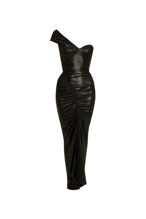 The artfully ruched skirt enhances the silhouette and flatters from every angle. It's cut for a slim fit from 'splended' shimmering stretch-jersey and has a Grecian-inspired single shoulder and asymmetric hem.
