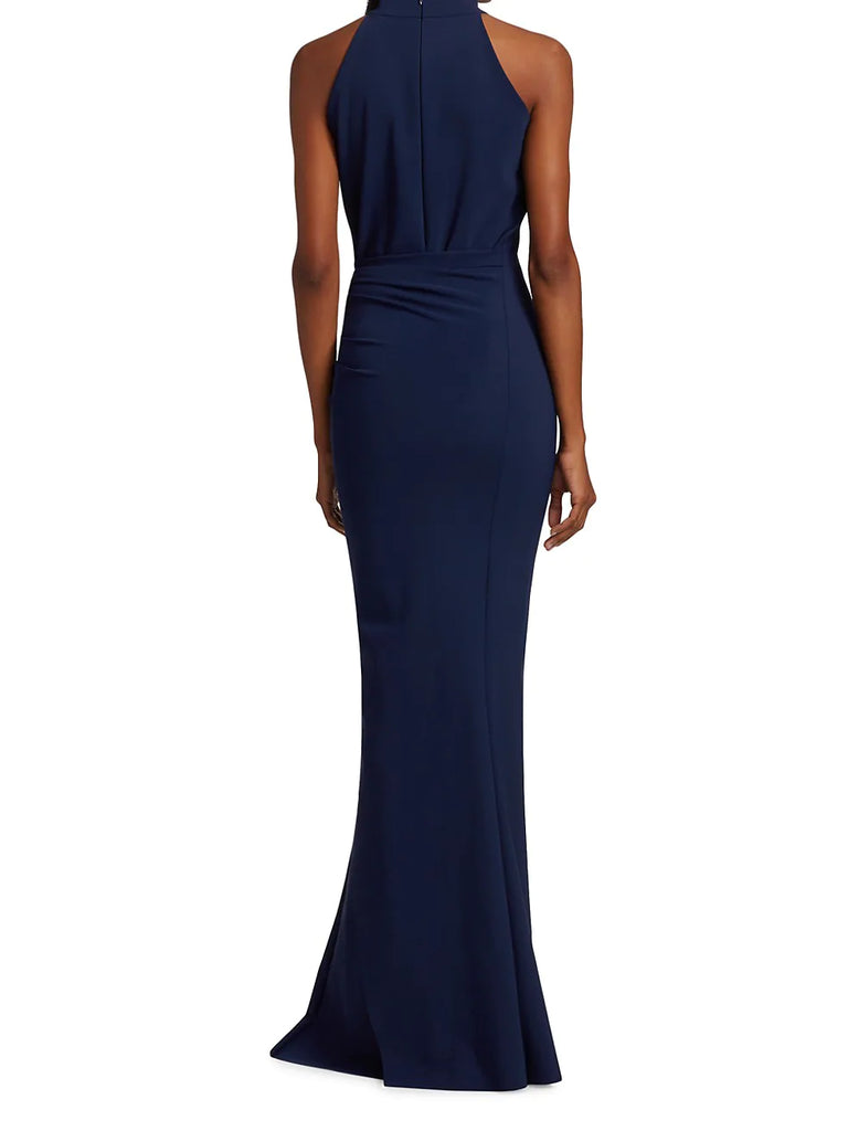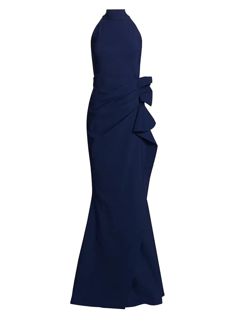 Chiara Boni La Petite Robe's Gudrum gown fits and flares from the mock halterneck to the flared hem. Crafted of stretchy fabric, this floor-length piece is detailed with dramatic ruffles on the side.